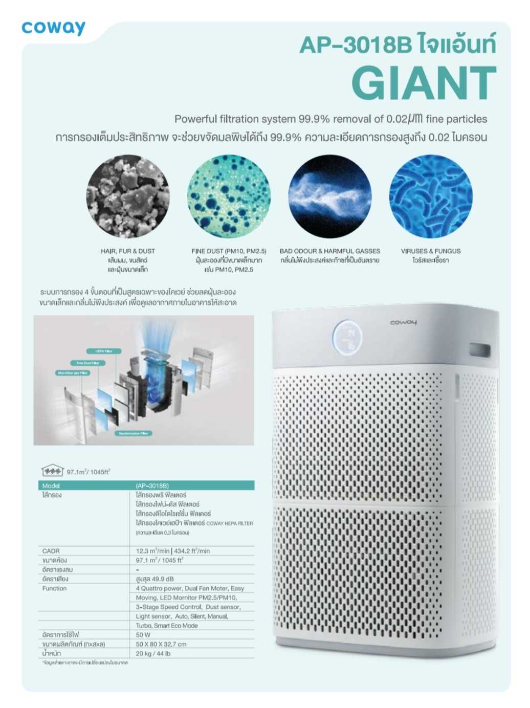 เครื่องฟอกอากาศโคเวย์ รุ่น AP-3018B (Giant) ไจแอนท์ สำหรับขนาดห้อง 97.1 ตารางเมตร