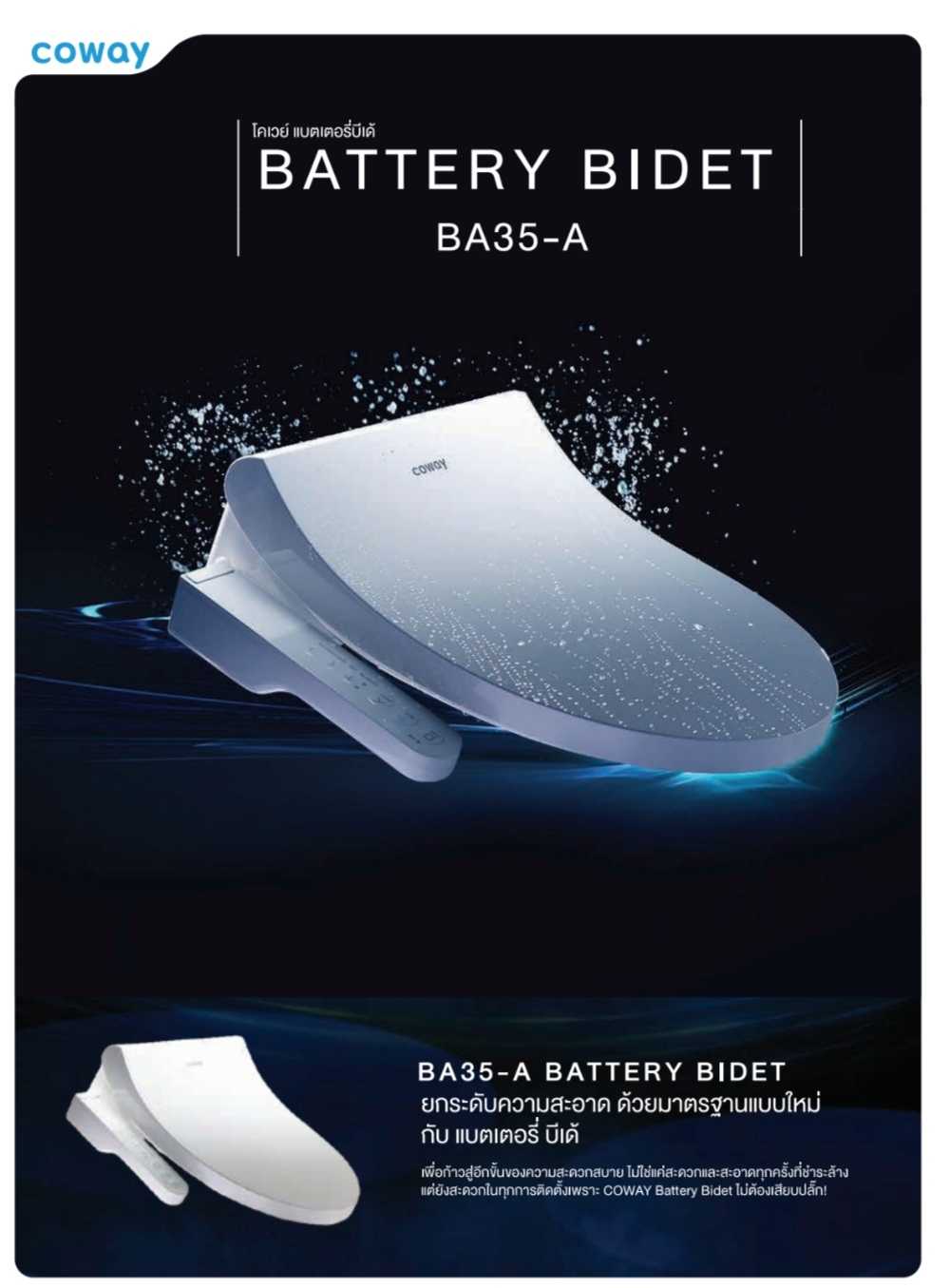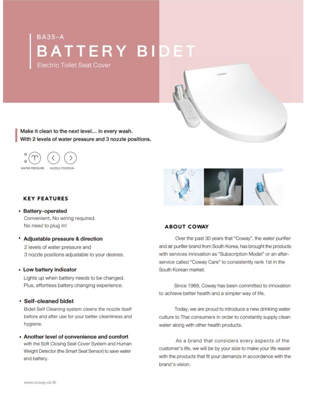 ไม่ต้องเสียบปลั๊กในการใช้งาน Coway ฝารองนั่งพร้อมที่ฉีดชำระล้างอัตโนมัติ รุ่น Battery Bidet BA35-A ใช้แบตเตอรี่่ AA 3 ก้อน ในการทำงาน